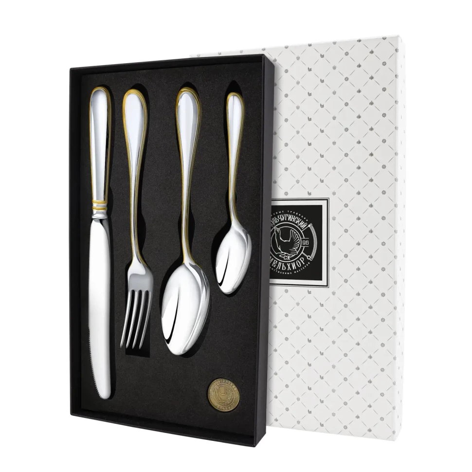Набор столовый "Капелька": вилка, ложка, нож, чайная ложка посеребренный с позолотой, Эгоист