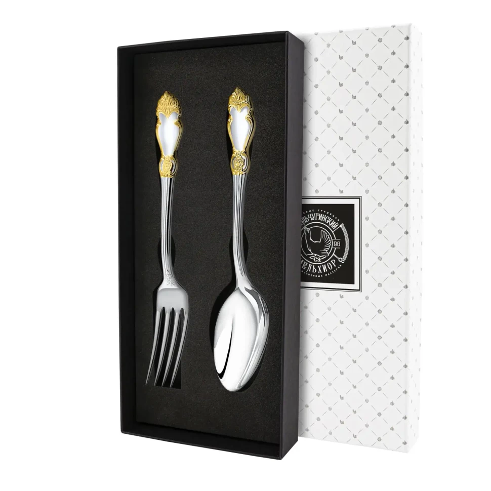 Набор столовый "Серебряная Роза": вилка и ложка с позолотой