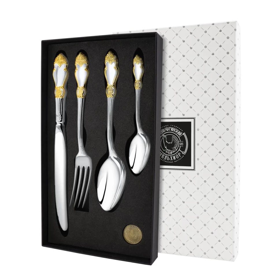 Набор столовый "Серебряная Роза": вилка, ложка, нож, чайная ложка посеребренный с позолотой