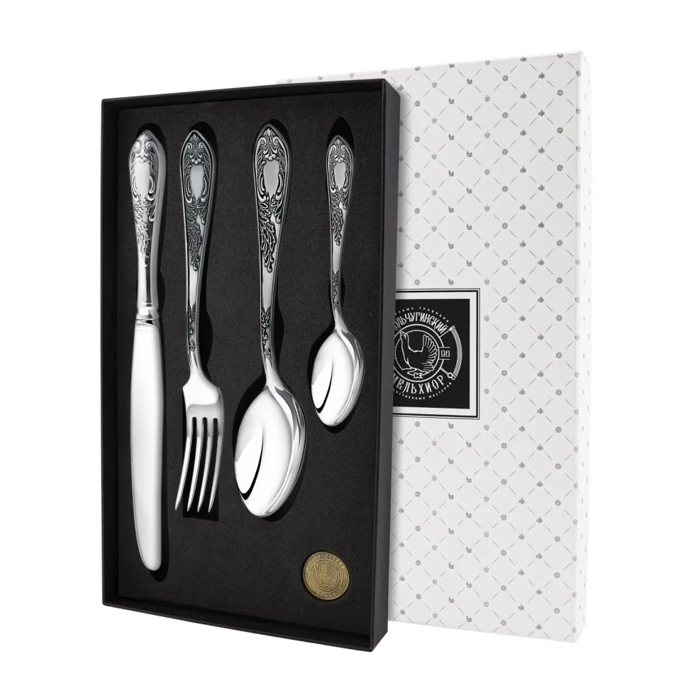 Набор столовый "Жасмин": вилка, ложка, нож, чайная ложка посеребренный с чернением. Эгоист.
