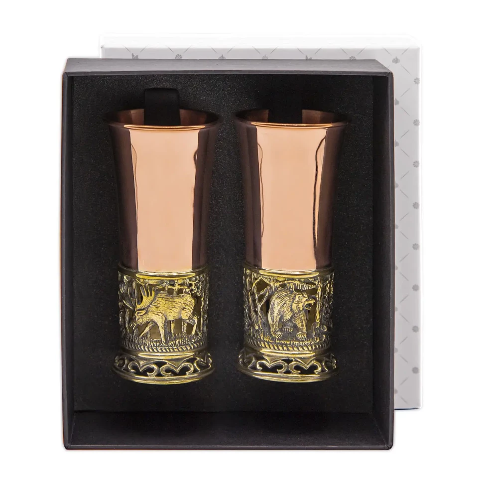 1. Стопка "Лось" медная с чернью арт. КМ1021СТ06 - 2шт. (средний вес 2 х 98 гр. = 196 гр.) Длина: 45 мм. Ширина: 45 мм. Высота: 110 мм. Диаметр: 45 мм. Объём: 65 мл.
