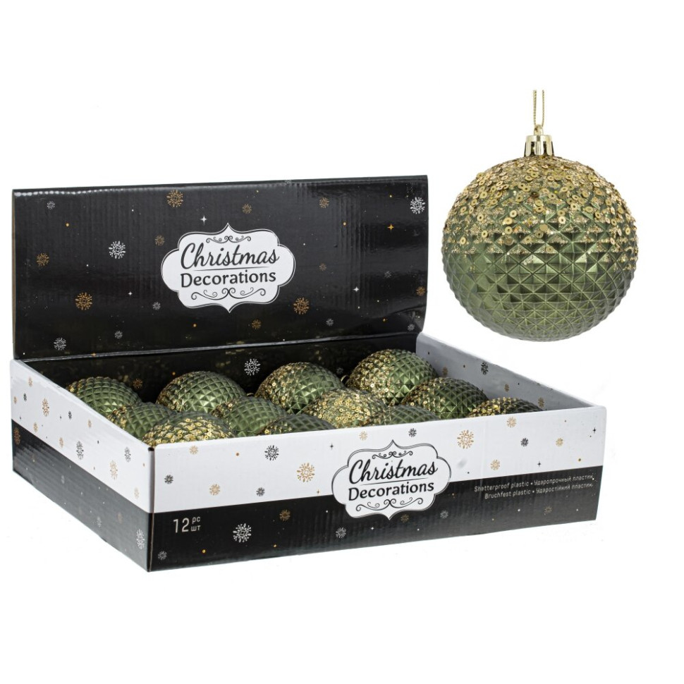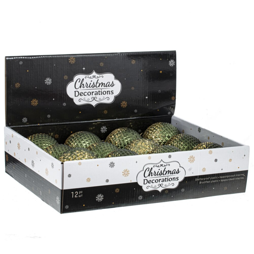 Набор из 12-ти шаров для елки в шоу-боксе. Эти новогодние шары из пластика, непременно, порадуют вас своим изяществом и прекрасно дополнят праздничный наряд лесной красавицы.