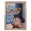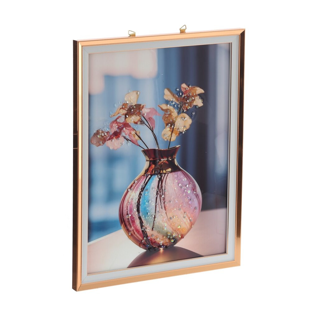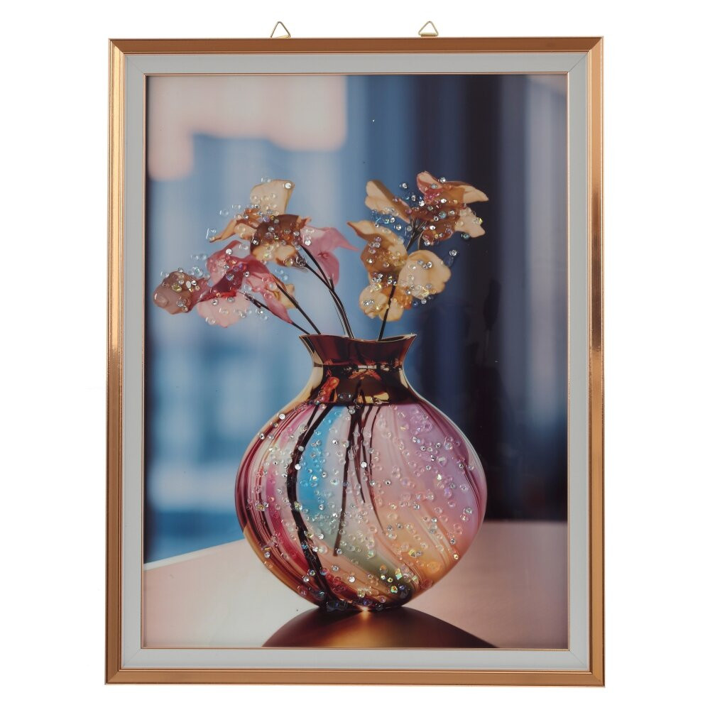 Настенное панно с кристальным декором – изысканный акцент для современного интерьера. На изображении – прозрачная ваза плавных округлых форм, переливающаяся розовыми, золотистыми и лазурными оттенками. Нежные цветы дополняются объемными кристаллами, которые мерцают при любом освещении и создают эффект капель росы. Панно оформлено в элегантную рамку под золото с контрастным внутренним обрамлением, благодаря чему картина смотрится аккуратно и завершённо. Идеально подойдёт для гостиной, спальни, кухни или офиса, придавая пространству атмосферу уюта, легкости и утончённой роскоши. Отличный вариант для подарка ценителям красивого декора.