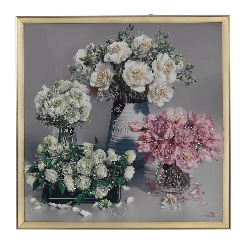 Элегантное настенное панно с кристальным декором станет изысканным акцентом в любом интерьере. На полотне изображены утончённые букеты белых и розовых цветов в стеклянных вазах и декоративном кувшине, дополненные нежной зеленью. Лепестки и бутоны украшены сияющими кристаллами, которые переливаются при дневном и искусственном освещении, создавая эффект объёмной живой композиции. Нейтральный серый фон подчёркивает насыщенность красок и делает картину универсальной для гостиной, спальни, столовой или прихожей. Лаконичная рамка тёплого золотистого оттенка придаёт работе завершённый, благородный вид и легко сочетается как с классическим, так и с современным стилем оформления дома. Панно станет удачным подарком любителям флористических мотивов и оригинального декора, привнесёт в пространство атмосферу уюта, романтики и лёгкой роскоши.