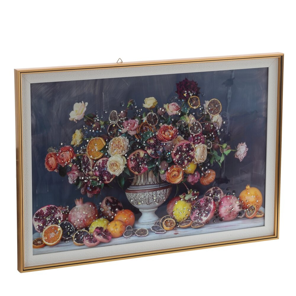Настенное панно с кристальным декором – эффектный акцент для гостиной, спальни или столовой. На темном фоне изображена роскошная композиция из садовых роз и спелых фруктов: гранатов, цитрусовых, инжира. Отдельные элементы букета и плодов украшены мерцающими кристаллами, которые создают объем и игру света, будто на цветах застыли капли росы. Детализированная печать передает естественные краски и фактуру, а тонкая рамка благородного золотистого оттенка подчеркивает богатую палитру изображения. Панно легко вписывается как в классический, так и в современный интерьер, добавляя ему нотку роскоши и художественной выразительности. Идеально в качестве подарка ценителям красивого декора и оригинальных интерьерных решений.