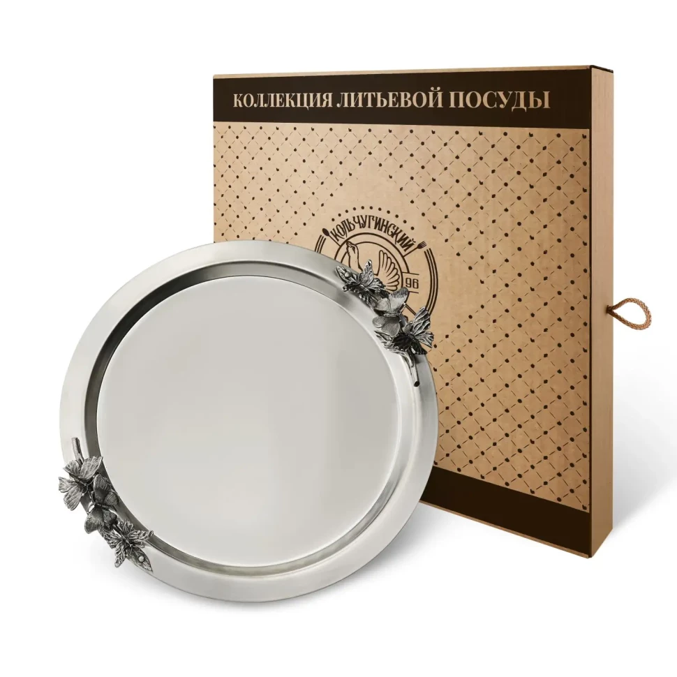 Поднос декоративный круглый с накладками "Бабочки" медный посереб.