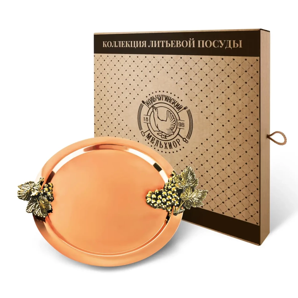 Поднос декоративный круглый с накладками "Виноград" (большая и малая) медный