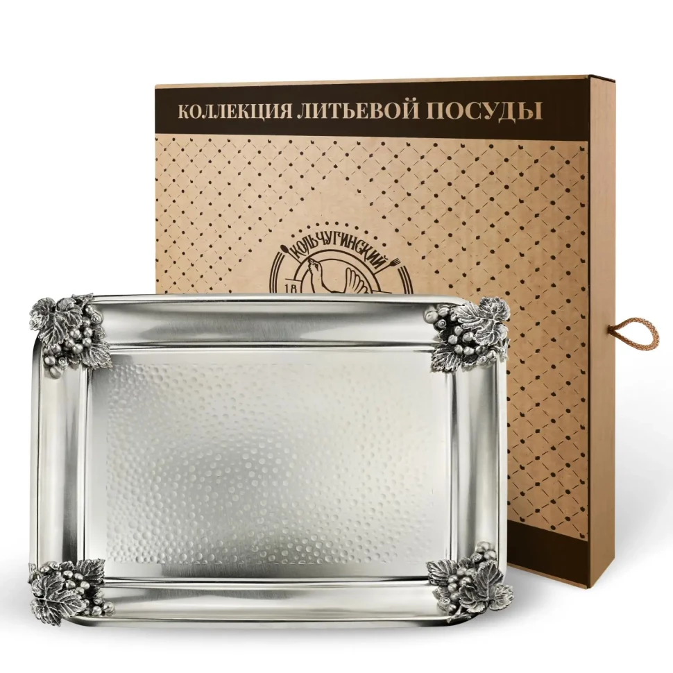 Поднос прямоугольный с накладками на углы "Виноград" медный посеребренный кованый