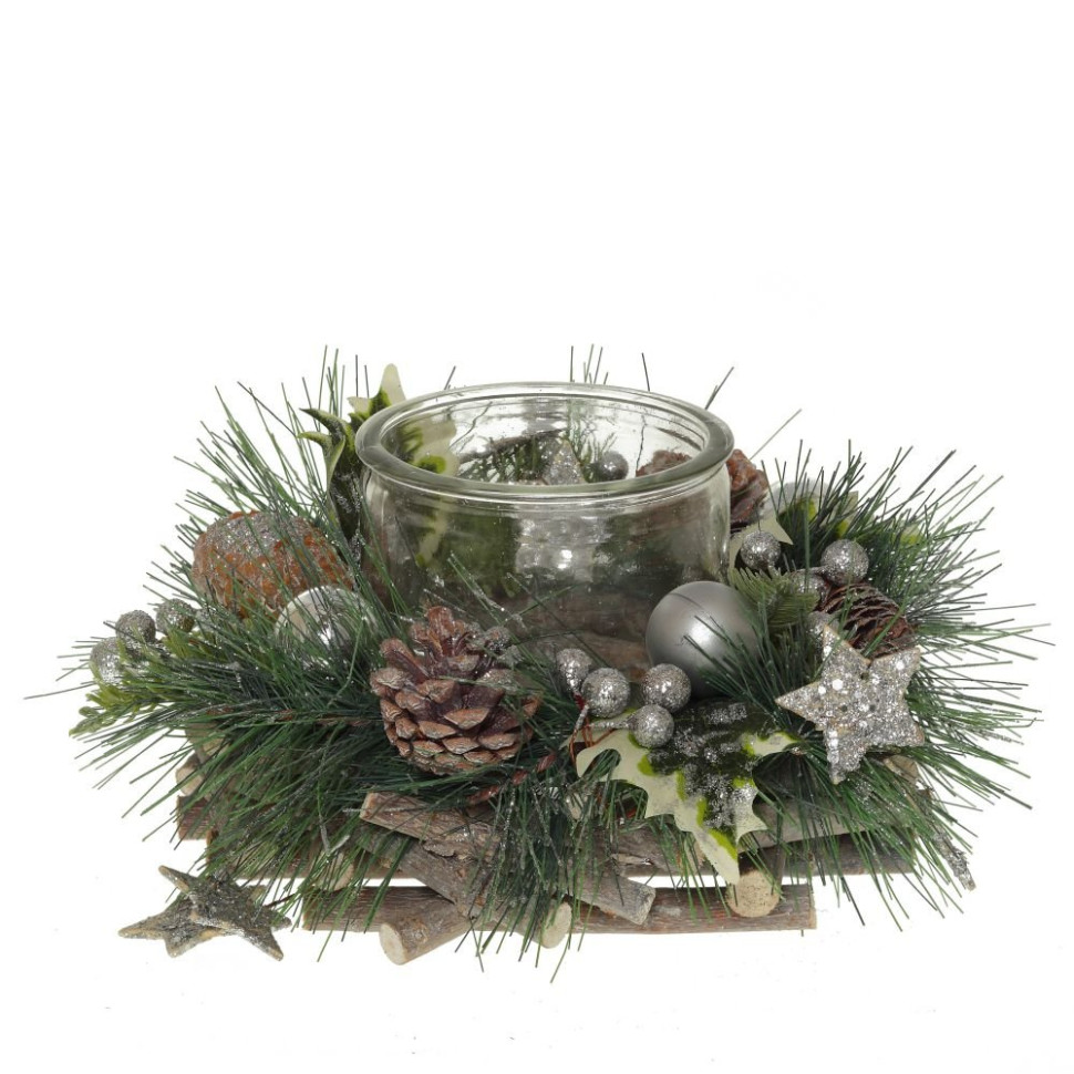 Подсвечник для одной свечи декорирован элементами из дерева, искусственными еловыми ветками, ягодами, шишками, шарами и звездами. Превосходное праздничное украшение интерьера.