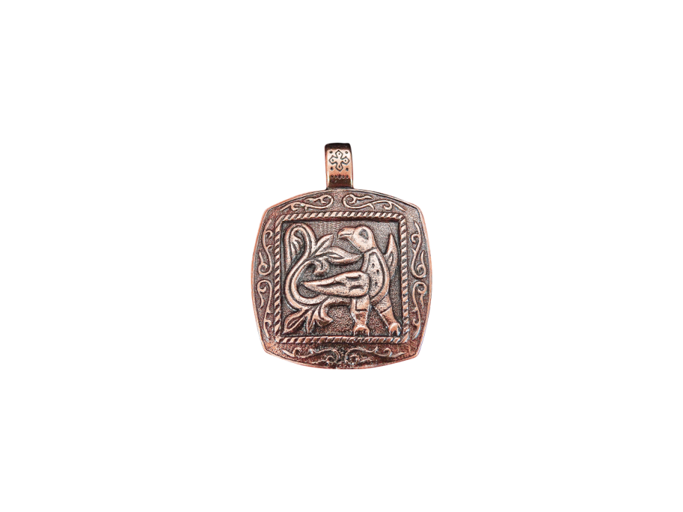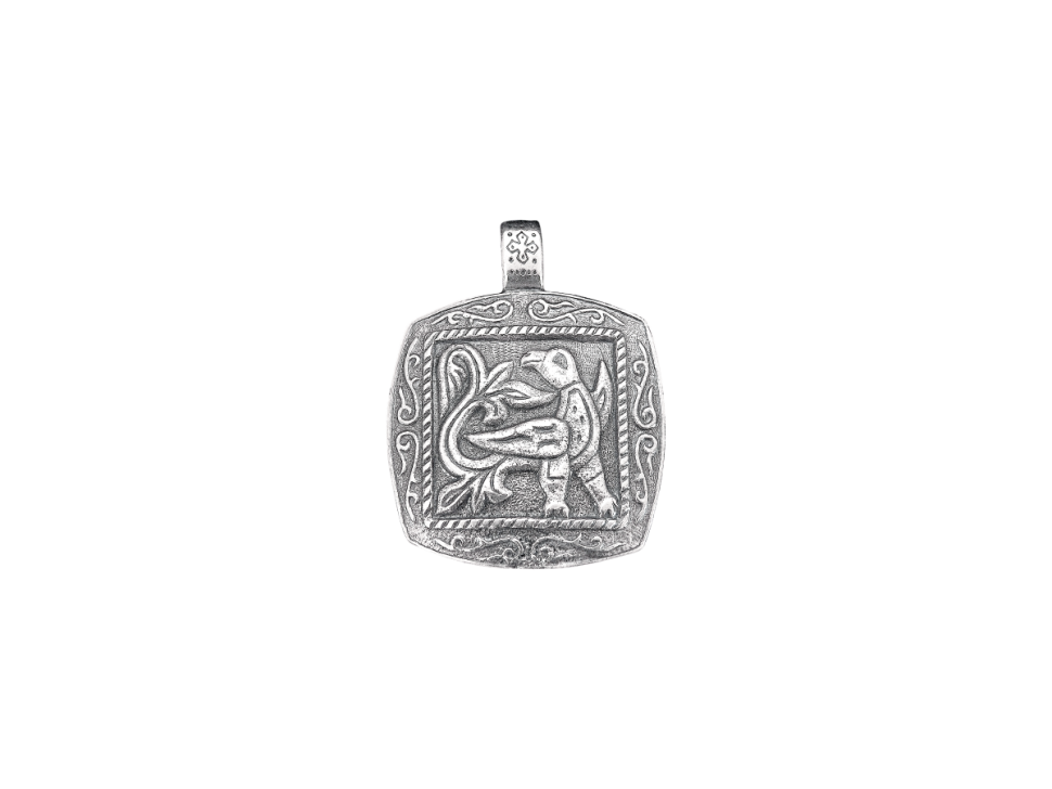 Подвеска с мирной птицей – символом души. Поднятое крыло – на творческий полёт, раскрытый хвост – пожелание процветания, по бокам подвески изображены молодые побеги – на удачу в начинаниях.