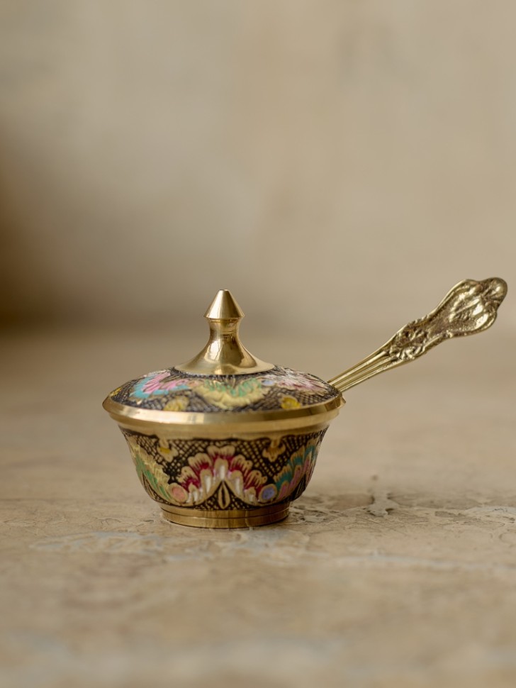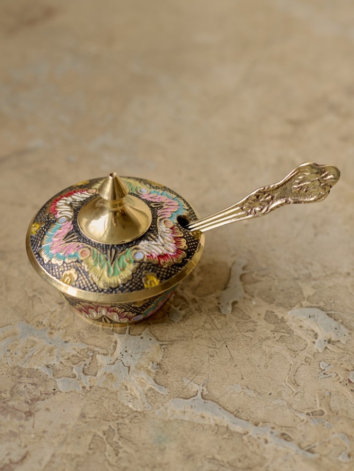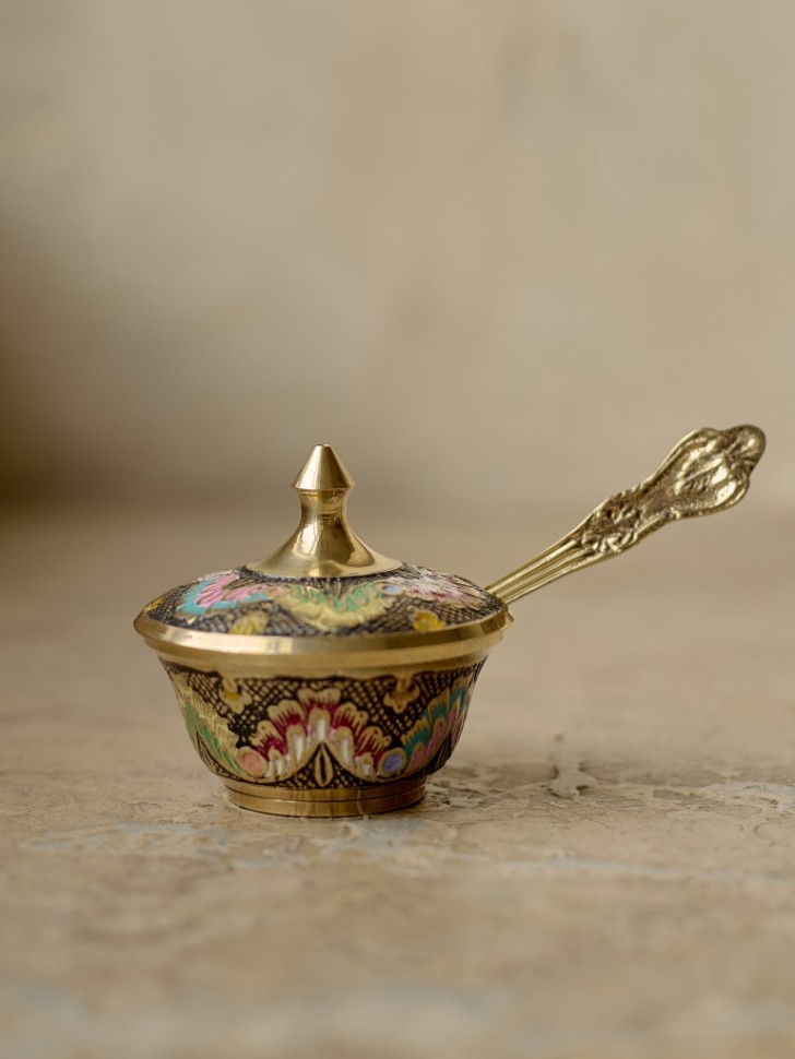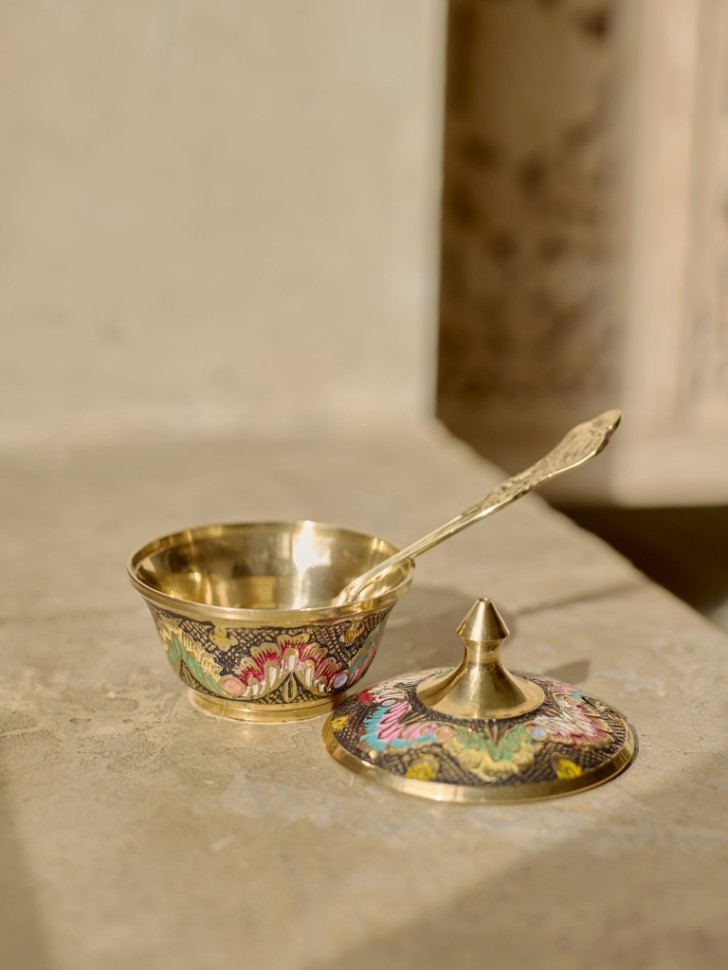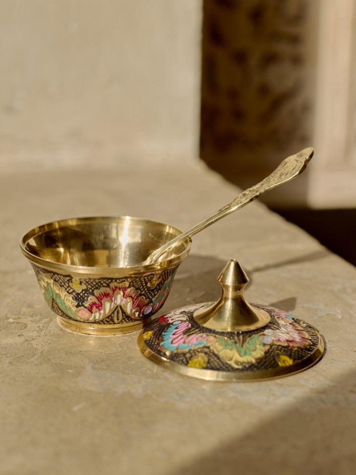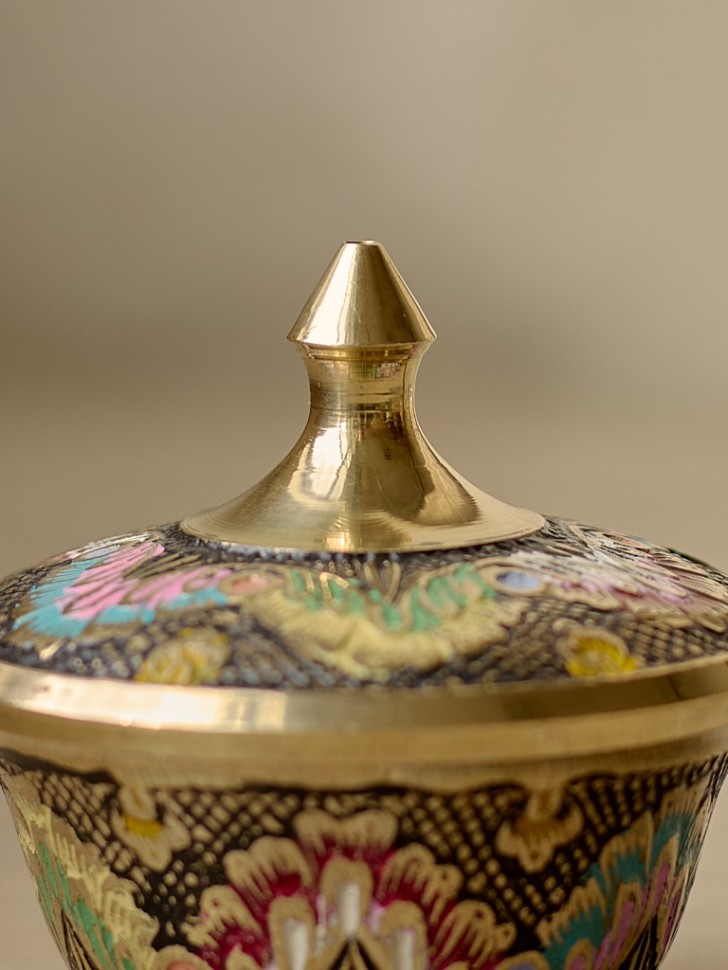 Латунное изделие ручной работы в восточном стиле. Цветная эмаль добавляет яркости традиционному орнаменту. Подойдёт для интерьера в восточном, этническом или бохо стиле.