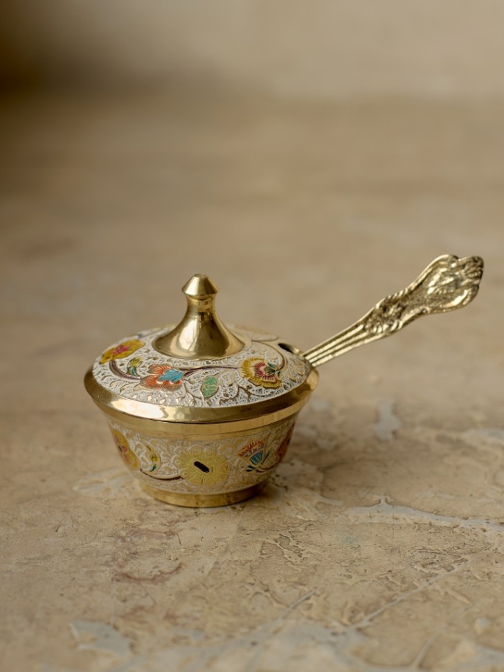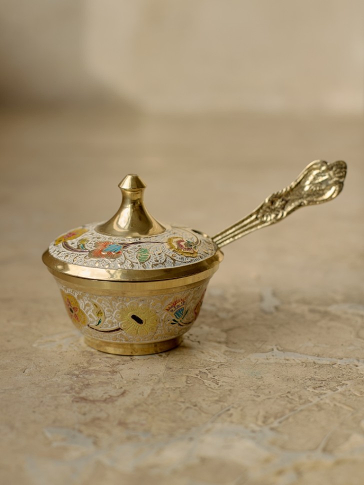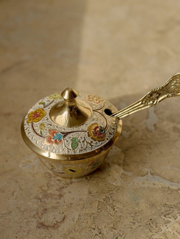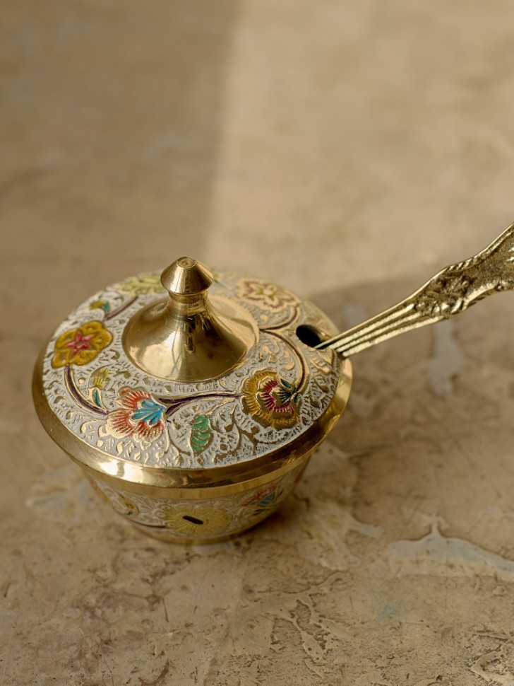 Латунное изделие ручной работы в восточном стиле. Цветная эмаль добавляет яркости традиционному орнаменту. Подойдёт для интерьера в восточном, этническом или бохо стиле.