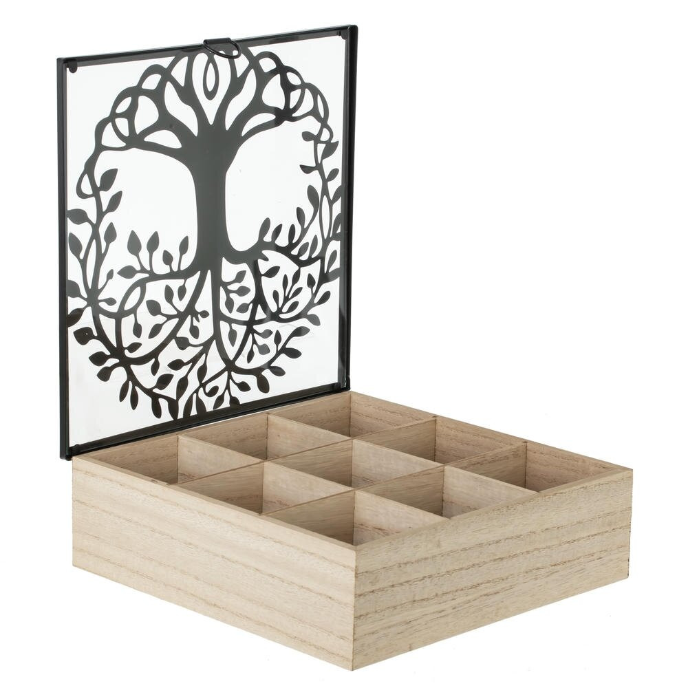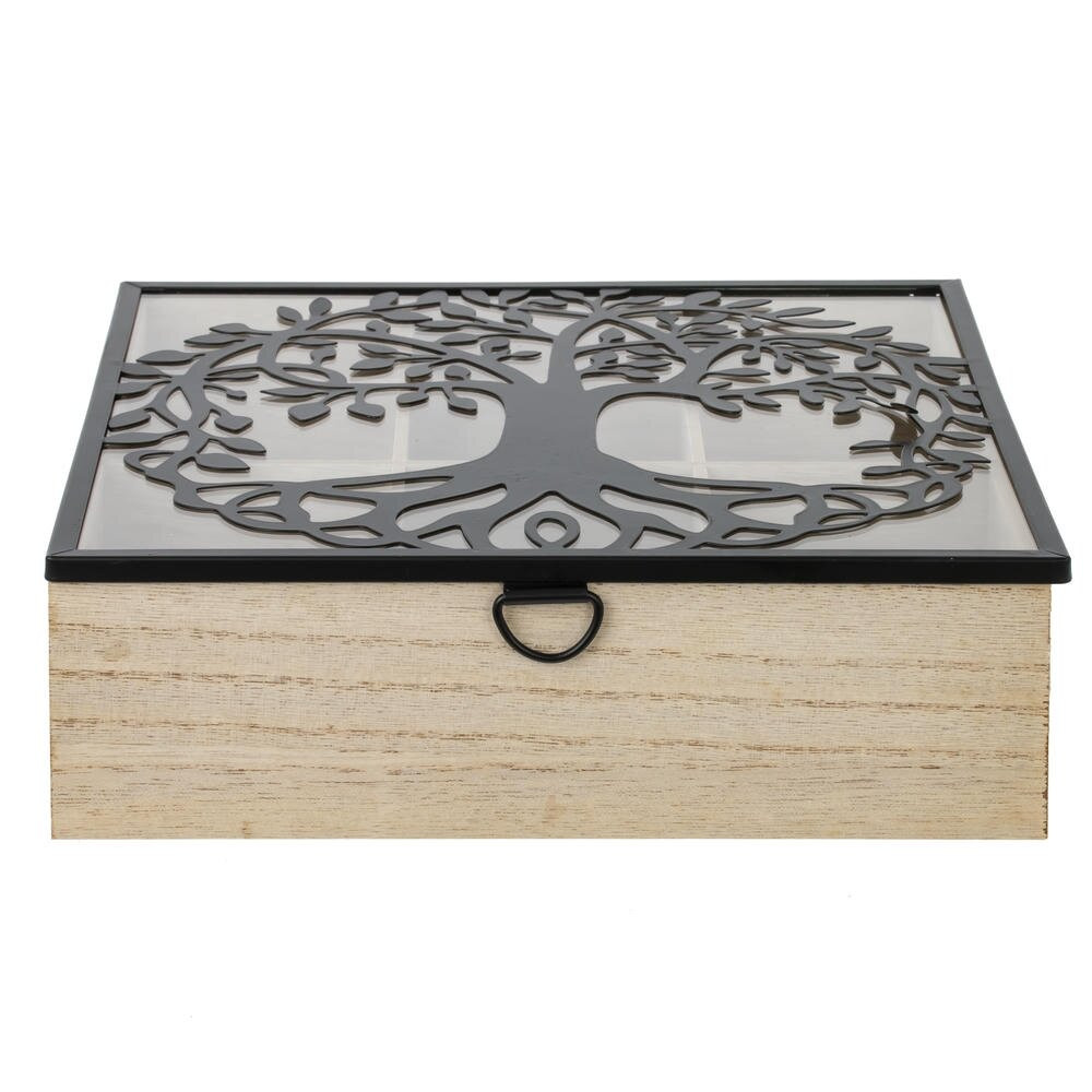 Стильная шкатулка для чайных пакетиков, выполненная из сочетания натурального дерева, прочного стекла и металла. Корпус из светлого дерева создает ощущение уюта и отлично впишется как в классический, так и в современный интерьер кухни или гостиной. Прозрачная стеклянная крышка позволяет легко увидеть содержимое, не открывая коробку, а изящный металлический декор в виде дерева придает изделию особый шарм и делает его выразительным акцентом на столе. Удобная металлическая ручка-скоба облегчает открывание. Внутри предусмотрены отдельные секции для аккуратного хранения различных сортов чая: гости и домочадцы быстро найдут любимый вкус. Такая шкатулка не только помогает поддерживать порядок, но и служит эффектным декоративным элементом и прекрасной идеей подарка для ценителей чайных церемоний.