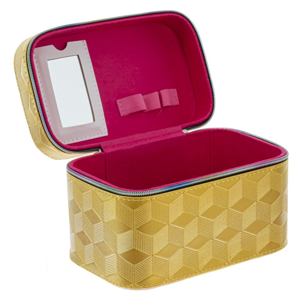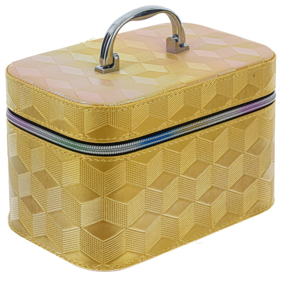 Шкатулка в виде чемоданчика выполнена из прочного материала и имеет элегантный дизайн, что делает ее не только функциональной, но и привлекательной. Крышка шкатулки закрывается на молнию, что обеспечивает надежную и безопасную защиту содержимого. Также на крышке установлена ручка для удобного переноса и транспортировки изделия . На внутренней части крышки встроено зеркальце, что делает ее еще более функциональной.