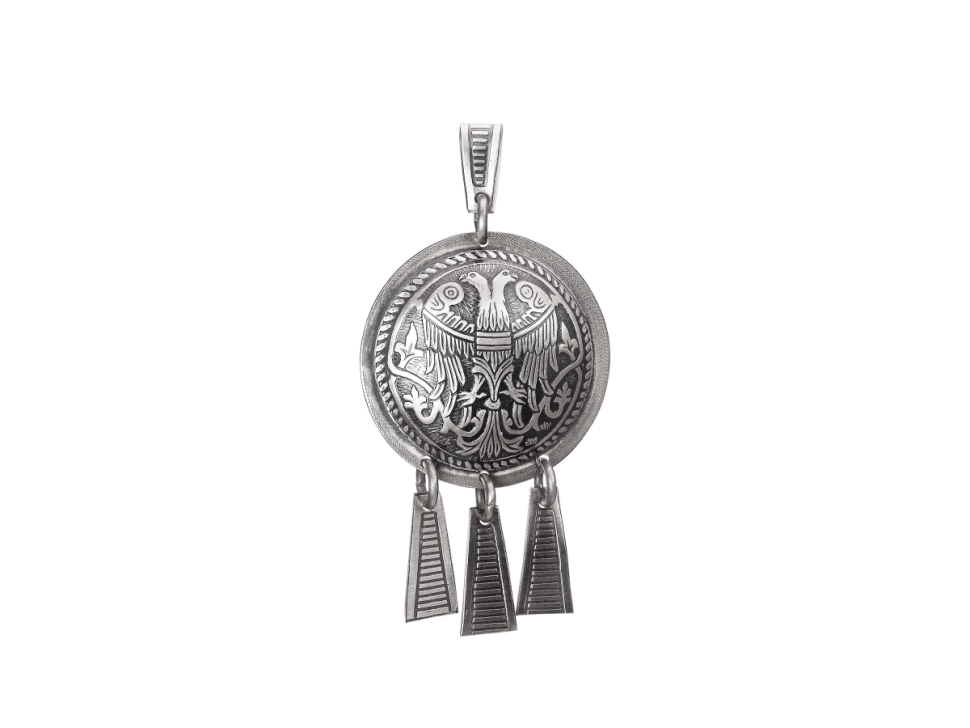 Подвеска круглой формы, украшенная изображением двуглавого орла - символа благородства и силы. Шумящие подвески - это мощный оберег, который защищает от злых сил, как своим обликом, так и шумом-шелестом.