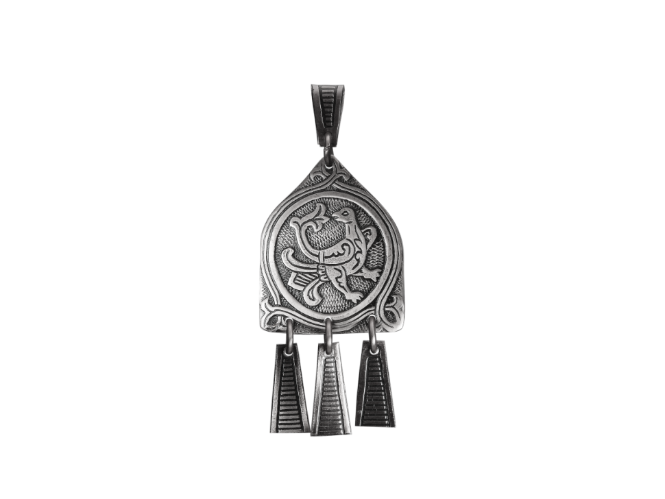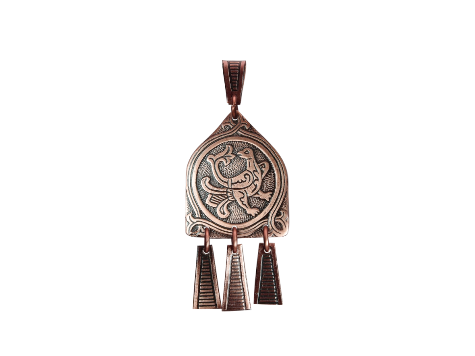 Красивая женская подвеска треугольной формы, украшенная шумящими привесками. Подвеска декорирована изображением Мирной птицы - символа процветания, благополучия и семейного счастья.