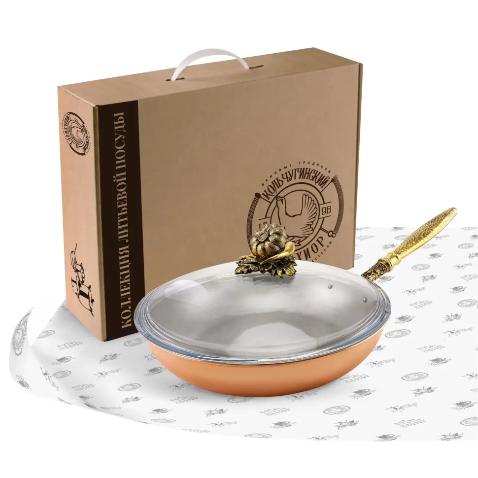 Сковорода средняя медная с лужением с крышкой "Чеснок" с резной ручкой