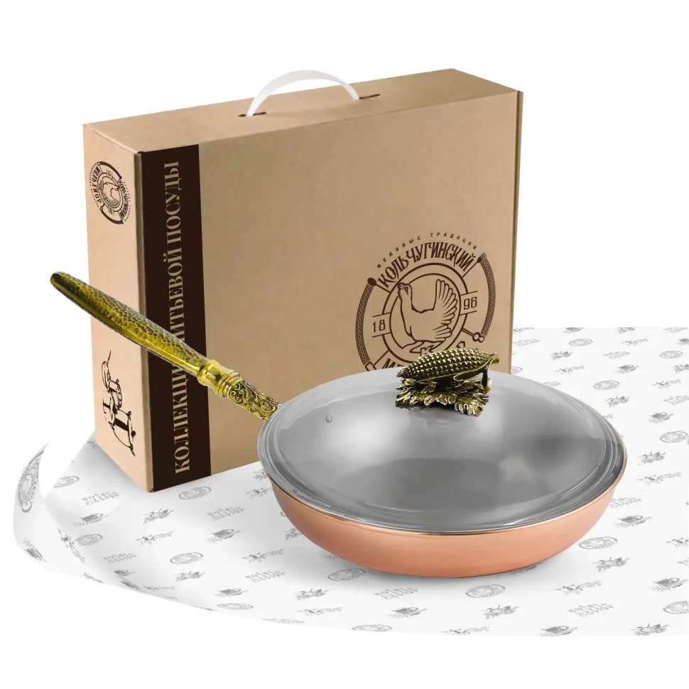 Сковорода средняя медная с лужением с крышкой "Кукуруза" с резной ручкой