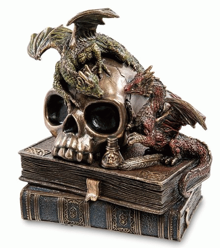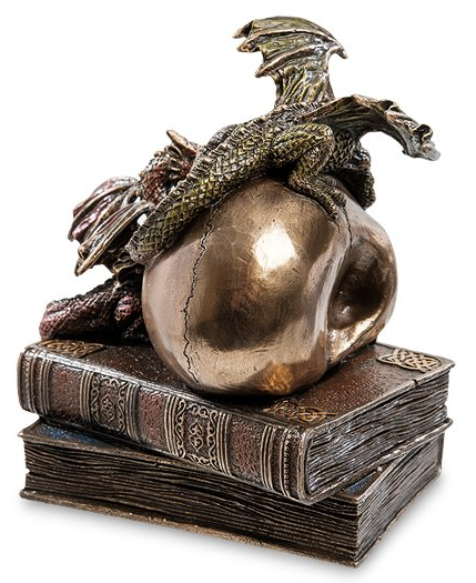Оригинальная декоративная статуэтка в виде черепа с драконами на книгах. Фигурка в стиле фэнтези станет яркой деталью Вашего интерьера и хорошим подарком.