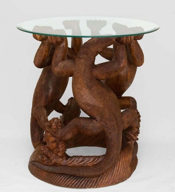 Роскошный интерьерный стол выполнен в виде резных ящериц темно-коричневого цвета, держащих стеклянную столешницу. Стол ручной работы станет эффектным украшением Вашего интерьера.