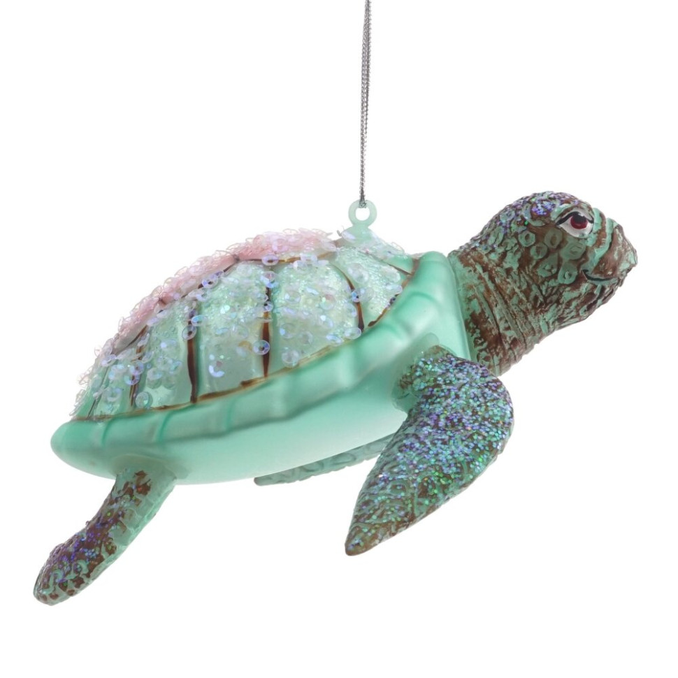 Украшение новогоднее "Черепаха" - это изысканное произведение искусства, выполненное из стекла и полимерных материалов. Детали головы и плавников проработаны с высокой детализацией, что придает этой игрушке особый шарм. Бирюзовый панцирь украшен пайетками и блестками, которые создают эффект сияния и привлекают внимание. Эта великолепная елочная игрушка станет ярким украшением праздничной елки и точно притянет к себе восторженные взгляды.