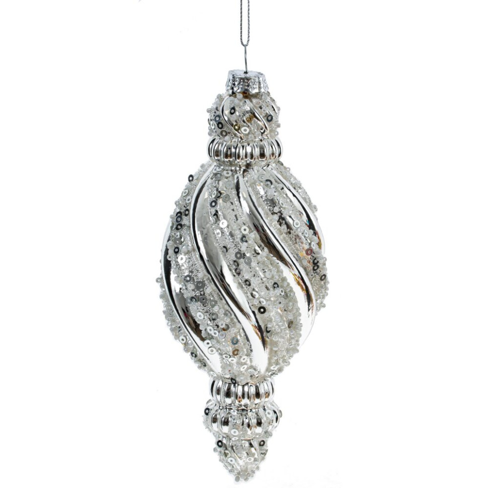 Елочное украшение в виде серебряной фигурной сосульки - это настоящее произведение искусства. Его вытянутая симметричная форма, слегка закрученная по спирали, придает изысканность и оригинальность. Украшение, выполненное из стекла, дополнительно украшено бисером и пайетками, что создает эффект мерцания и блеска. Серебряный колпачок с петелькой и ниточкой для подвешивания делает его практичным и удобным в использовании. Такое украшение станет изысканным акцентом на новогодней елке.
