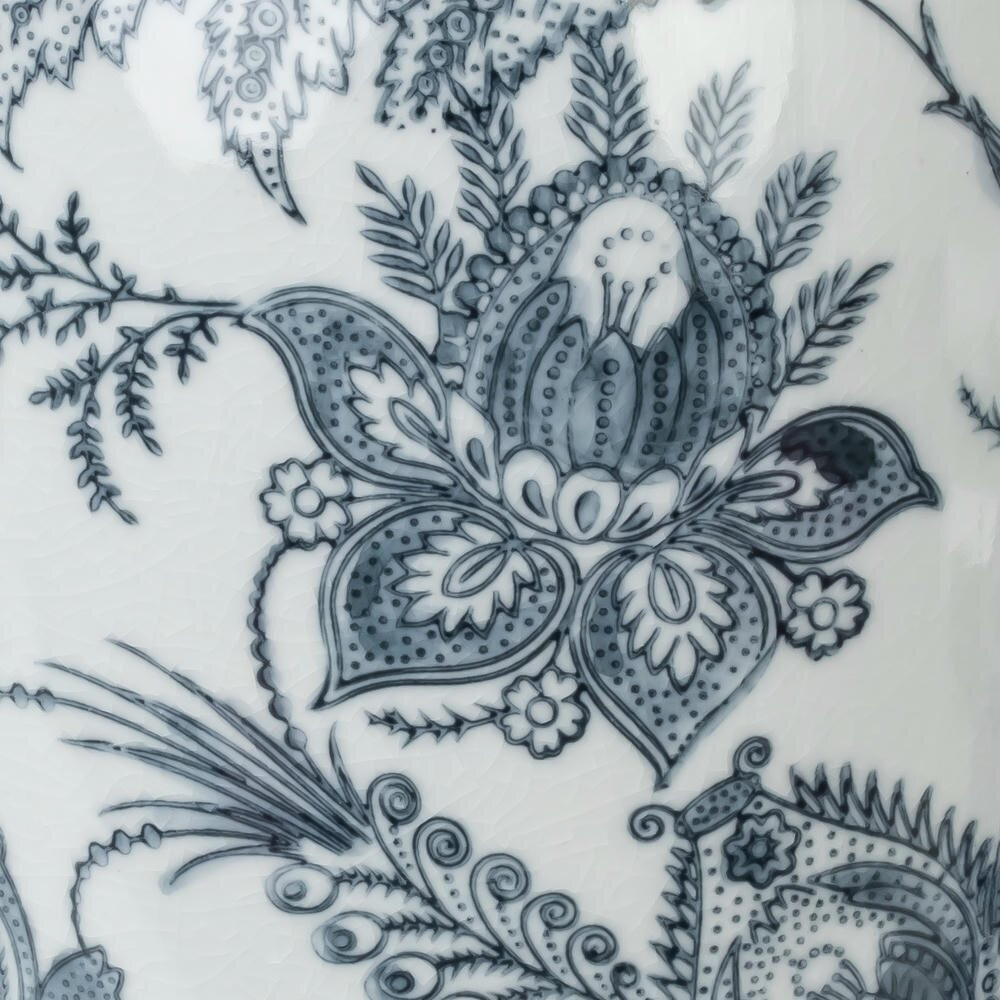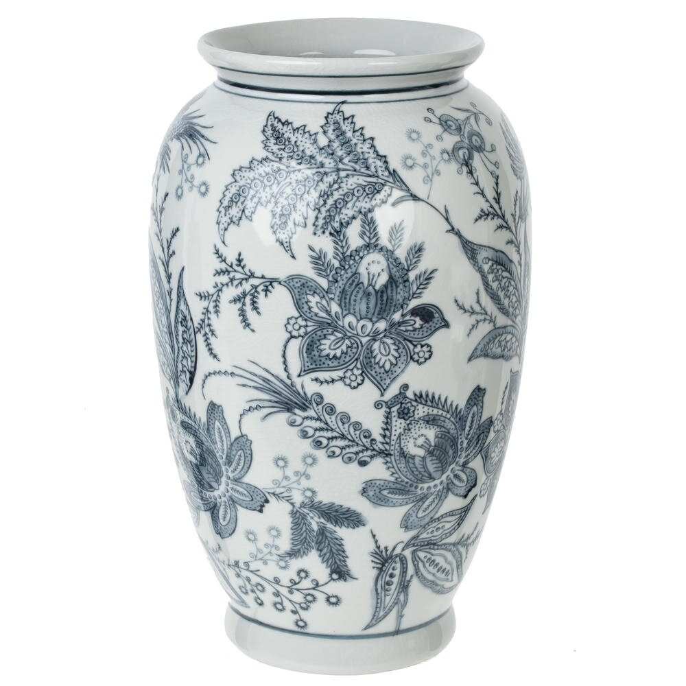 Элегантная ваза объёмом 5200 мл из высококачественного фарфора станет выразительным акцентом в любом интерьере. Классическая форма с плавно расширяющимся корпусом подчёркивает изящество изделия, а белоснежная поверхность украшена тонким сине?серым растительным орнаментом в традиционном стиле. Детально прорисованные цветы и листья создают ощущение ручной росписи и придают вазе особый шарм. Модель отлично подойдёт для крупных букетов, декоративных веток или как самостоятельный элемент декора гостиной, спальни или холла. Гладкая глазурованная поверхность легко очищается и надолго сохраняет первоначальный блеск, а прочный фарфор устойчив к образованию пятен и выцветанию рисунка. Диаметр горловины: 11 см.