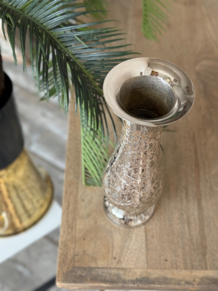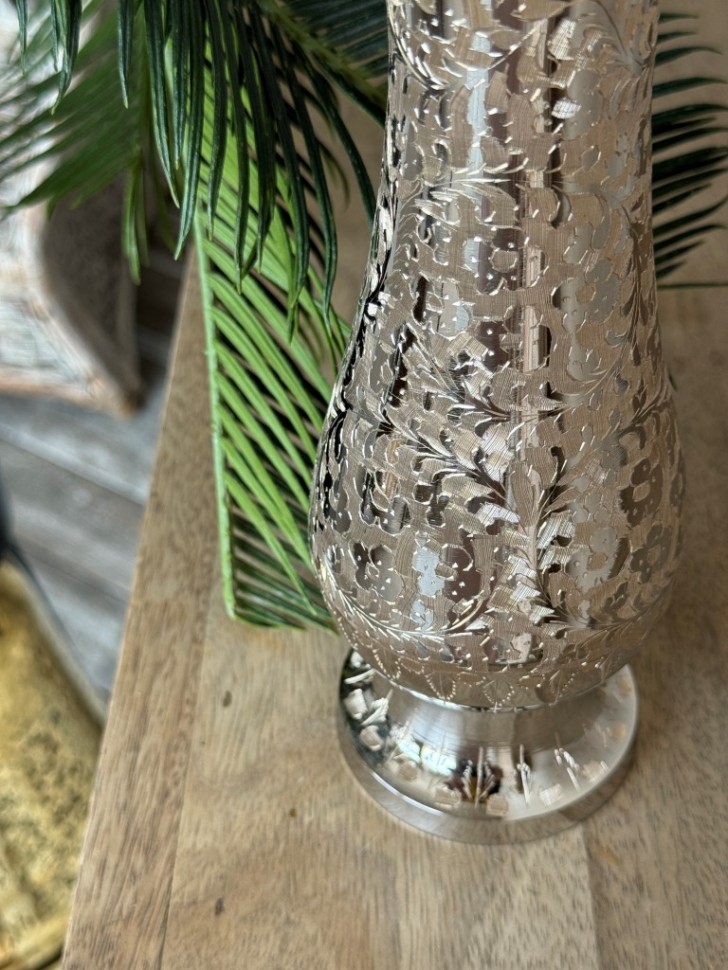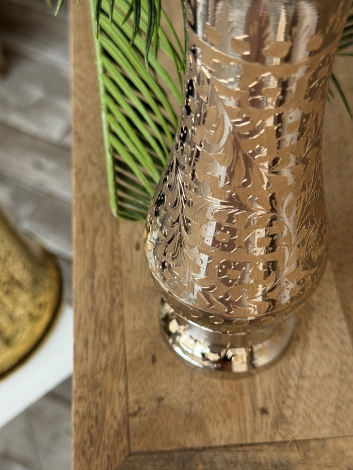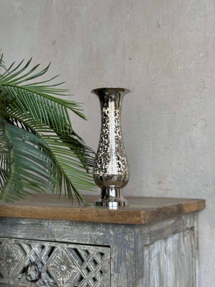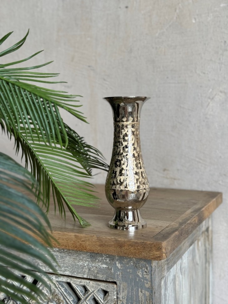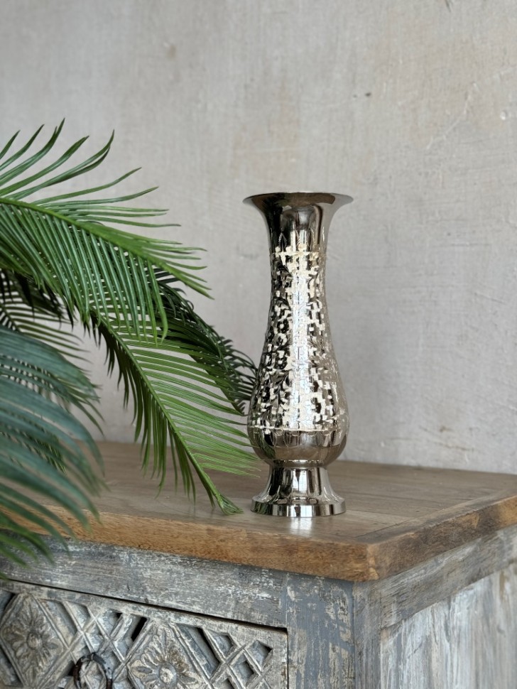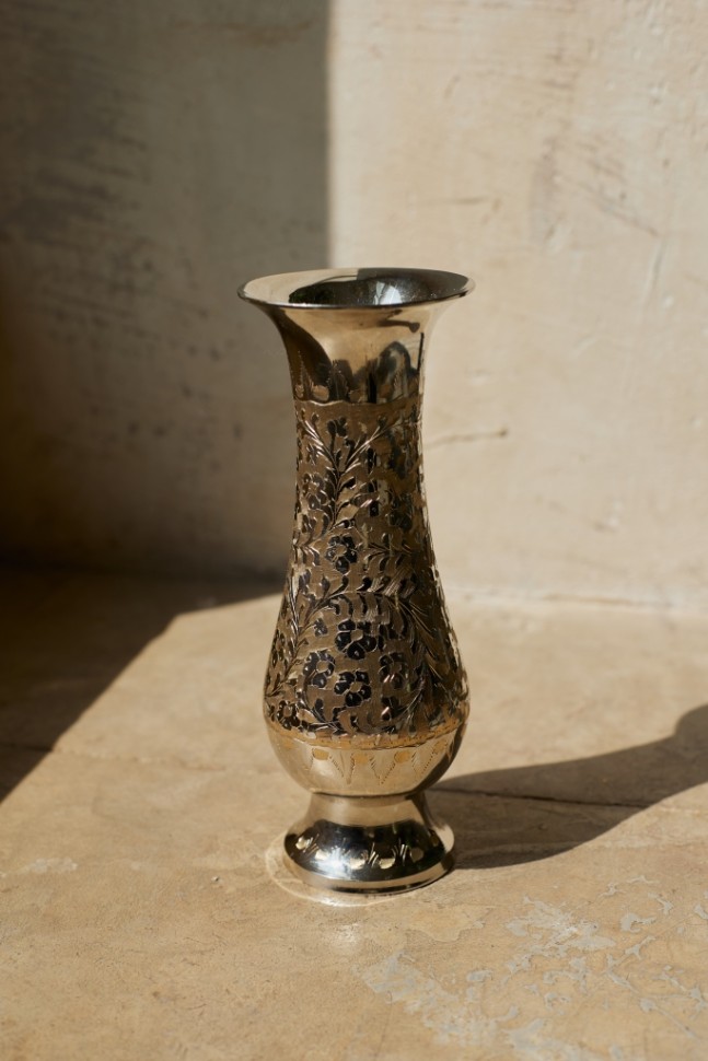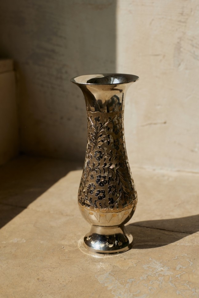 Декоративная ваза из цельной латуни с традиционной индийской резьбой. Покрытие никелем придаёт изделию благородный серебристый блеск. Коллекция Firki — характерный спиральный орнамент. Лаконичная форма «стакан» универсальна для любого интерьера. Подойдёт для интерьера в восточном, этническом или бохо стиле.