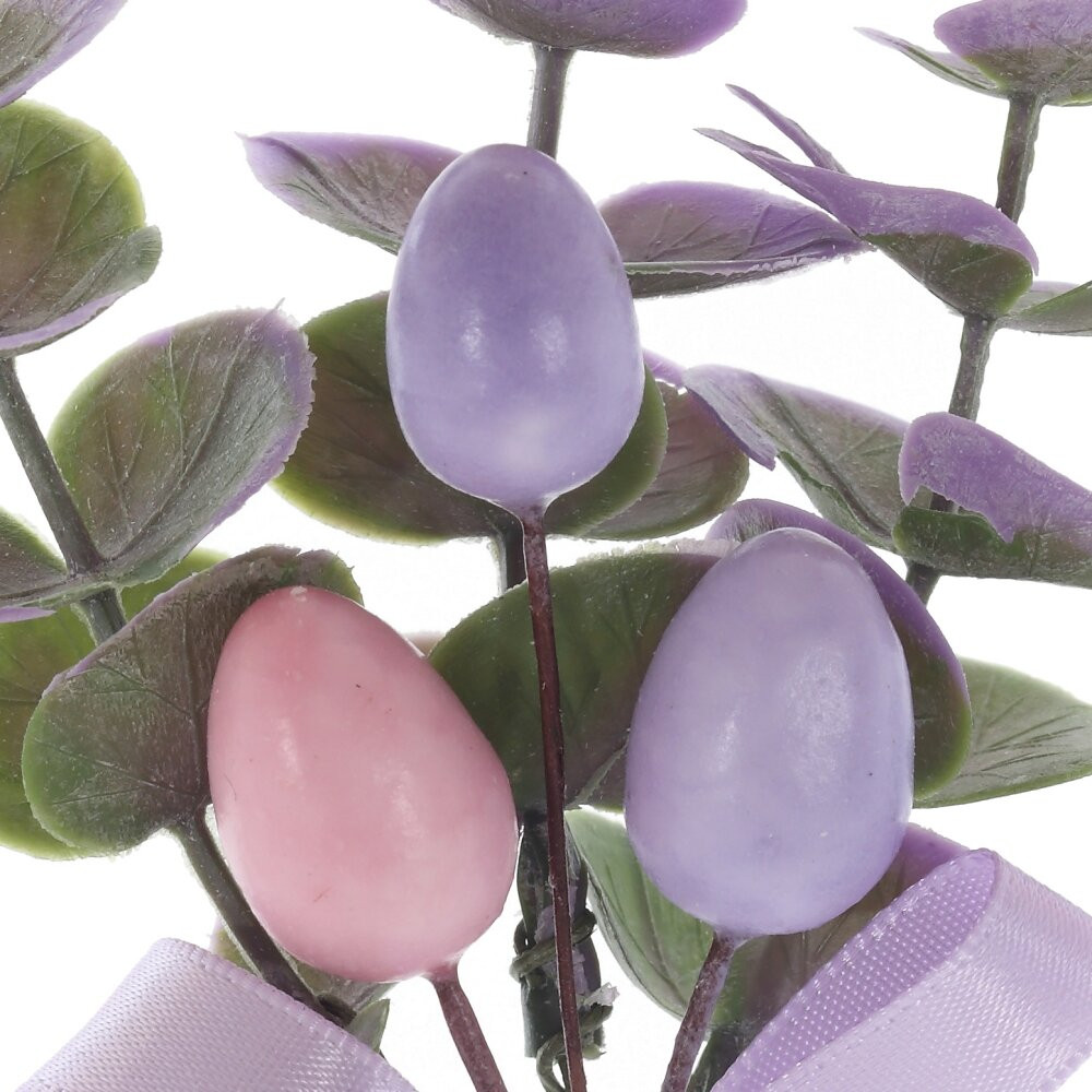 Искусственная ветка «Пасхальная» – изящный декоративный акцент для оформления дома к светлому празднику. На зеленых и сиреневых листочках расположены миниатюрные пасхальные яички нежных пастельных оттенков, а стебель украшен аккуратным бантом из сиреневой ленты. Ветка выполнена из прочных полимерных материалов с металлической основой, не ломается, не выцветает и надолго сохраняет форму. Подходит для создания пасхальных композиций, украшения праздничного стола, корзин, венков и букетов, легко комбинируется с живыми и искусственными цветами.