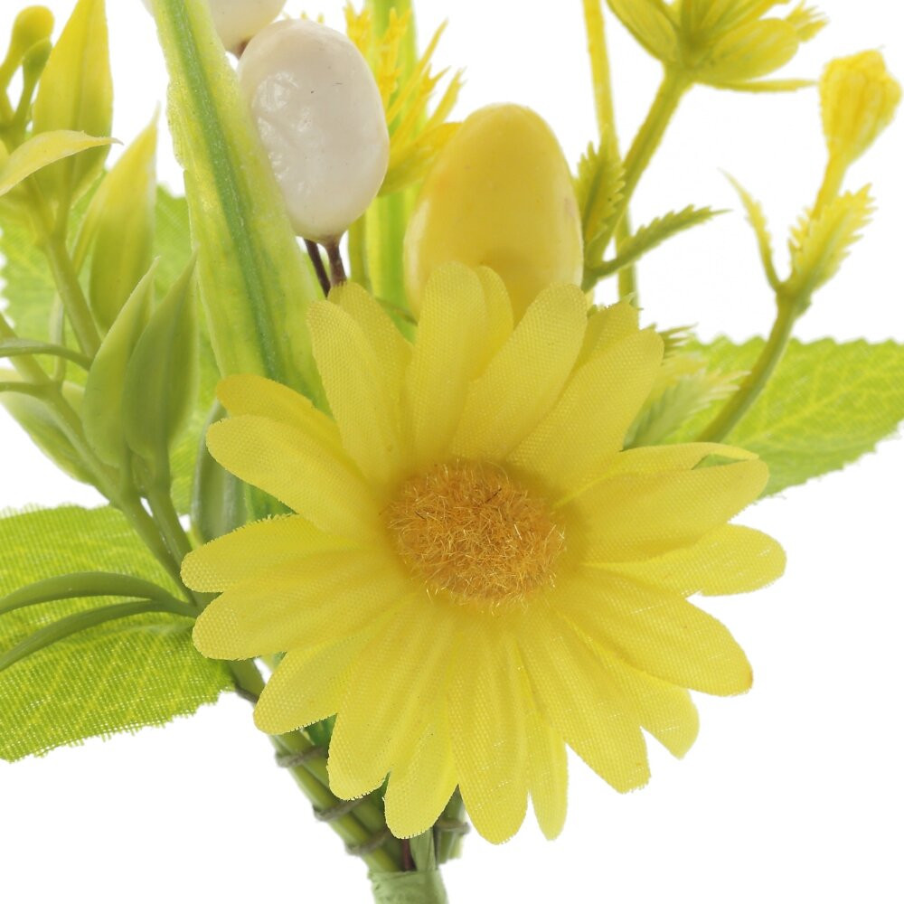 Искусственная ветка «Пасхальная» — яркий и жизнерадостный декор к светлому празднику Пасхи. Композиция выполнена в солнечно?жёлтой гамме: нежный цветок ромашки, пушистые соцветия, изящные зелёные листочки и декоративные яйца создают ощущение весенней свежести и обновления. Ветка отлично подойдёт для оформления праздничного стола, корзин с куличами и яйцами, создания пасхальных композиций, венков и букетов. Материал устойчив к выгоранию и не требует ухода, украшение сохранит насыщенный цвет и аккуратный вид многие сезоны. Идеальное решение для тех, кто хочет быстро и эффектно преобразить интерьер к Пасхе.